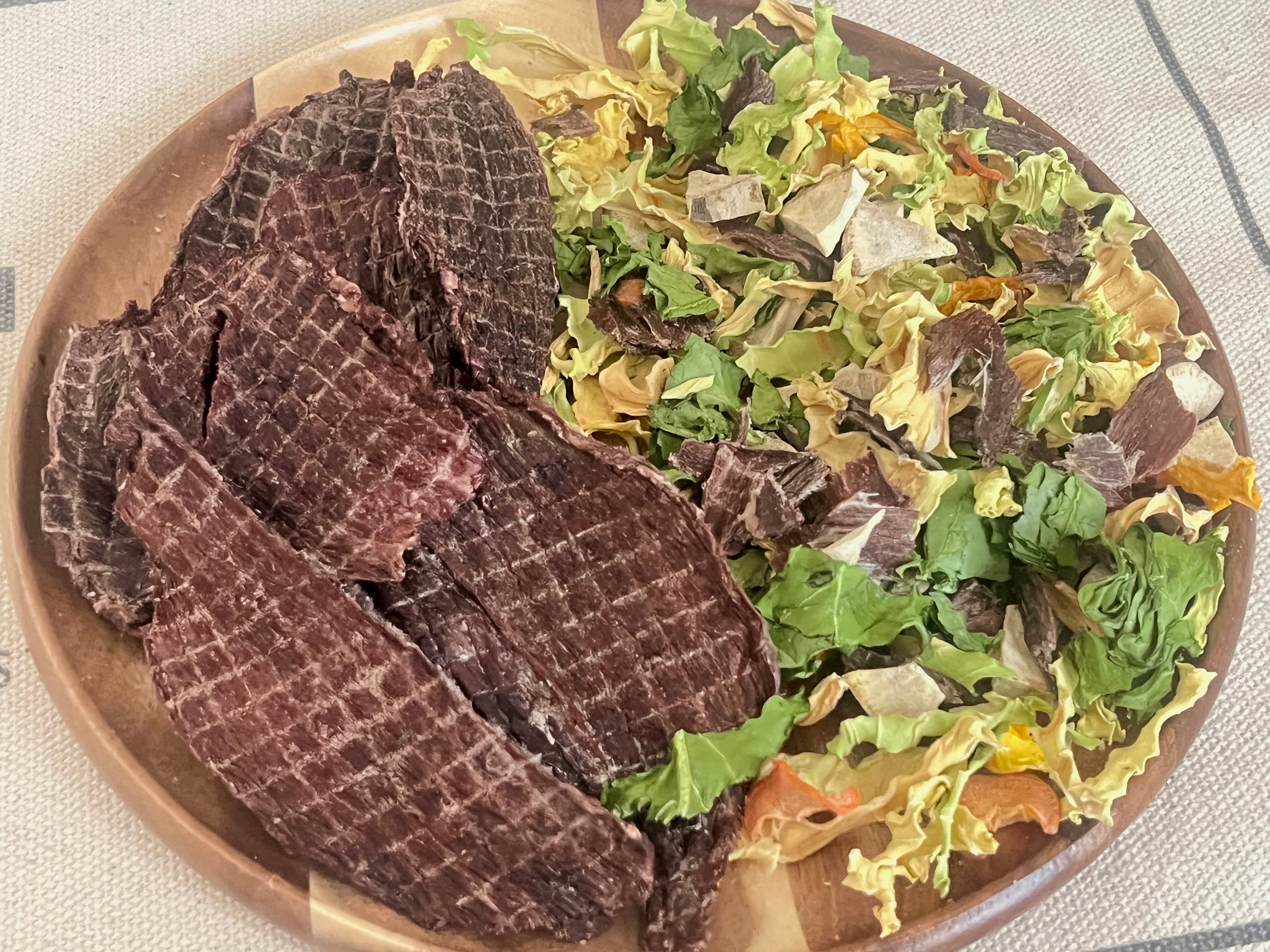 【完全無添加ジャーキー】と【鹿肉入り5種の野菜トッピングミックス】のセットです。